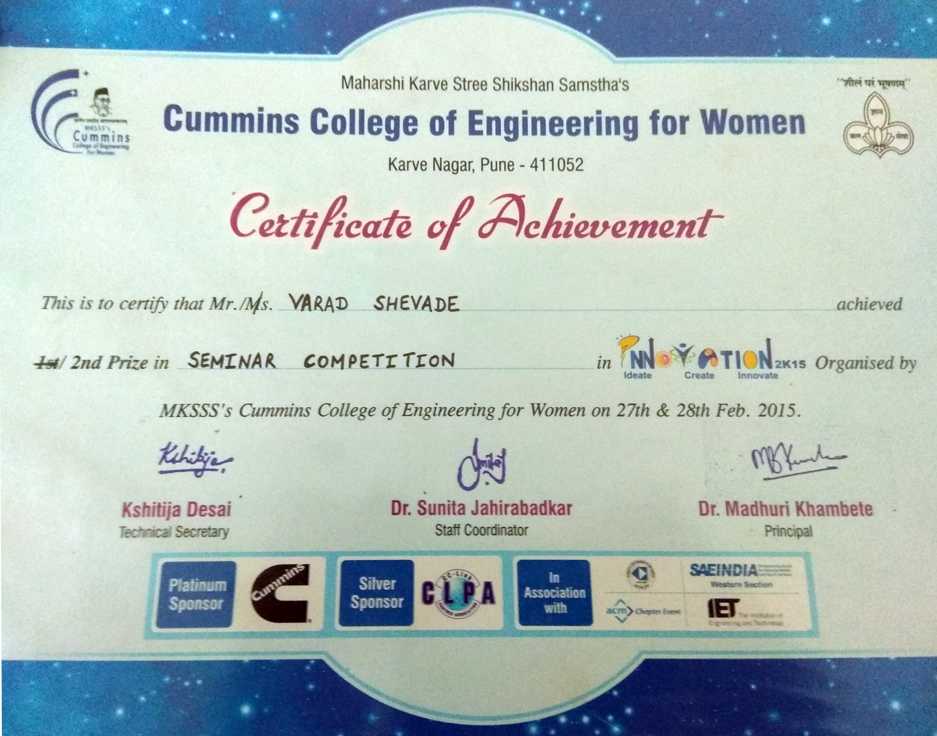 Certificate of Achievement - Cummins College of Engineering for Women, 2015