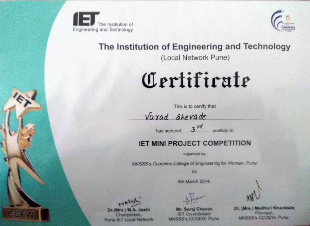3rd Prize in mini project competition conducted by IET(Local Network Pune).