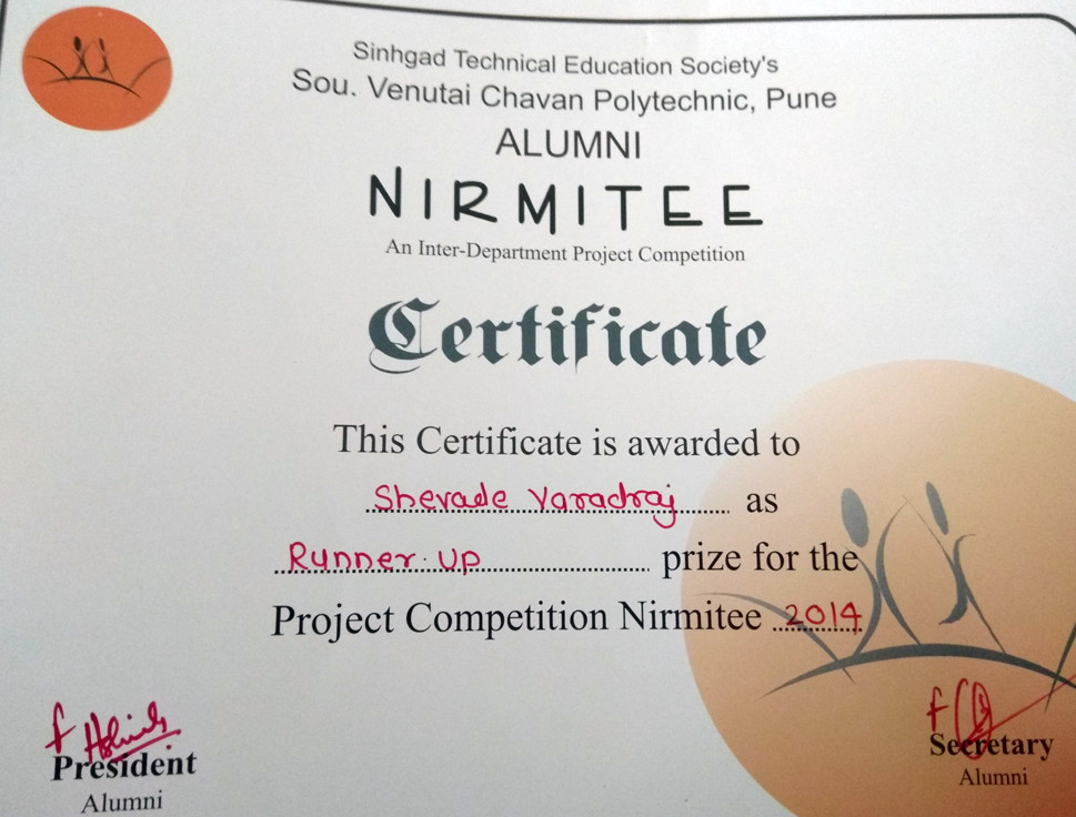 Runner Up at "Nirmiti" an interdepartment project competition.