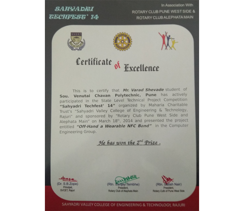 Certificate of Excellence - Sahyadri Valley College of Engineering and Technology, 2014