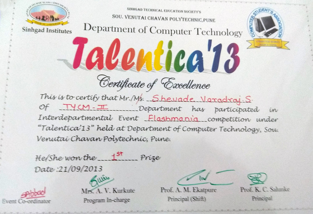 Certificate of Excellence - Sou. Venutai Chavan Polytechnic, 2013